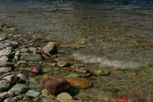 Lake Shore Glacier National Park, Montana A small wave completes its few mile journey across Two Medicine Lake, meeting a shoreline comprised diverse, mineral-rich rocks. This area was once the sacred ground of the Blackfeet and other Native American tribes. |