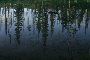 Lodgepole Reflection Grand Teton National Park, Wyoming A stand of lodgepole pine reflects off a tranquil String Lake in northwestern Wyoming. The dominant tree in the area, lodgepole pine is found throughout the Rocky Mountains from the Yukon to Colorado. This area is susceptible to forest fires, which destroy the seed sources of other tree species, leaving little competition for the dominant lodgepole pine. |