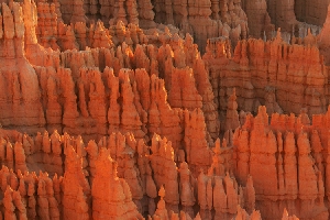 Pinnacles Bryce Canyon National Park, Utah Rows of hoodoos radiate the rays of an early morning sun. Hoodoos are formed when natural forces erode lower layers of sedimentary rock that are then protected by a harder top layer. Their shapes depend upon the patterns of erosion that may be influenced by differences in the hardness of the sedimentary rock. |