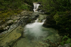 Ptarmigan Creek Glacier National Park, Montana Ptarmigan Creek descends gracefully over an abundance of colorful rock. Two hundred waterfalls are found throughout the park, where streams, rivers and lakes are often the only relief from dense forests that dominate Glacier’s sub-alpine topography. |