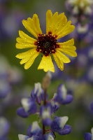 Madia Dew Stanislaus National Forest, California Early morning dew rests on a Madia flower, one of only a few in a meadow dominated by thousands of purple Lupine flowers. A genus of herbs, the Madia is in the same family as its more popular relative, the Sunflower. |