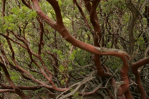 Manzanita Sequoia National Forest, California The distinctive bark of the Mariposa Manzanita plant highlights a network of branches making up a dense stand near Kings Canyon National Park. The Manzanita is rare in general, but is common in this region of northern California. The plant blooms year-round, bearing berries that resemble apples, which in Spanish is manzanita. |