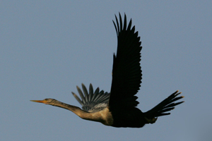 The Anhinga Bonita Springs, Florida With an impressive wingspan of up to four feet, an Anihinga bird flies eloquently through the humid Florida air. Anhingas dive underwater to catch their prey, which includes crayfish, shrimp, young alligators and water snakes. The bird’s feathers are not waterproof, enabling them to dive more deeply for prey than other birds that are more buoyant. |