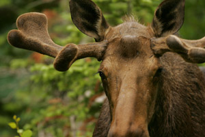 Moose Head Glacier National Park, Montana A bull moose breaks from foraging in a willow thicket on the edge of a dense pine forest deep within the vast Montana wilderness. Like other cervids, the moose is an herbivore, but is the largest of the species with males weighing up to 1,200 pounds. This bull’s antlers will become full grown in another few weeks before they are shed by the moose over winter. |