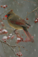 Northern Cardinal Avon, Connecticut A Northern Cardinal braves the falling snow in search of food. Soon it will return to its nearby nest, located in the density of numerous nearby pines. The Northern Cardinal typically builds a cup-shaped nest made of thin twigs and grasses in well-concealed areas. |