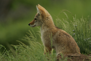 Thinking It Through Yellowstone National Park, Wyoming A Coyote pup eagerly waits for his siblings to follow him from their den for a day of play. This pup ventured 150 feet from the den across a small meadow and up a rocky embankment, where he sat waiting while occasionally expressing his curiosity. |