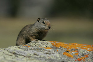 Uinta Squirrel Yellowstone National Park, Wyoming A Uinta Ground Squirrel peers from behind a rock near Slough Creek in the backcountry of Yellowstone National Park. The squirrel prefers grasslands that are always located near water, as is the case at this location. It eats a variety of foods including seeds, insects and even meat. |